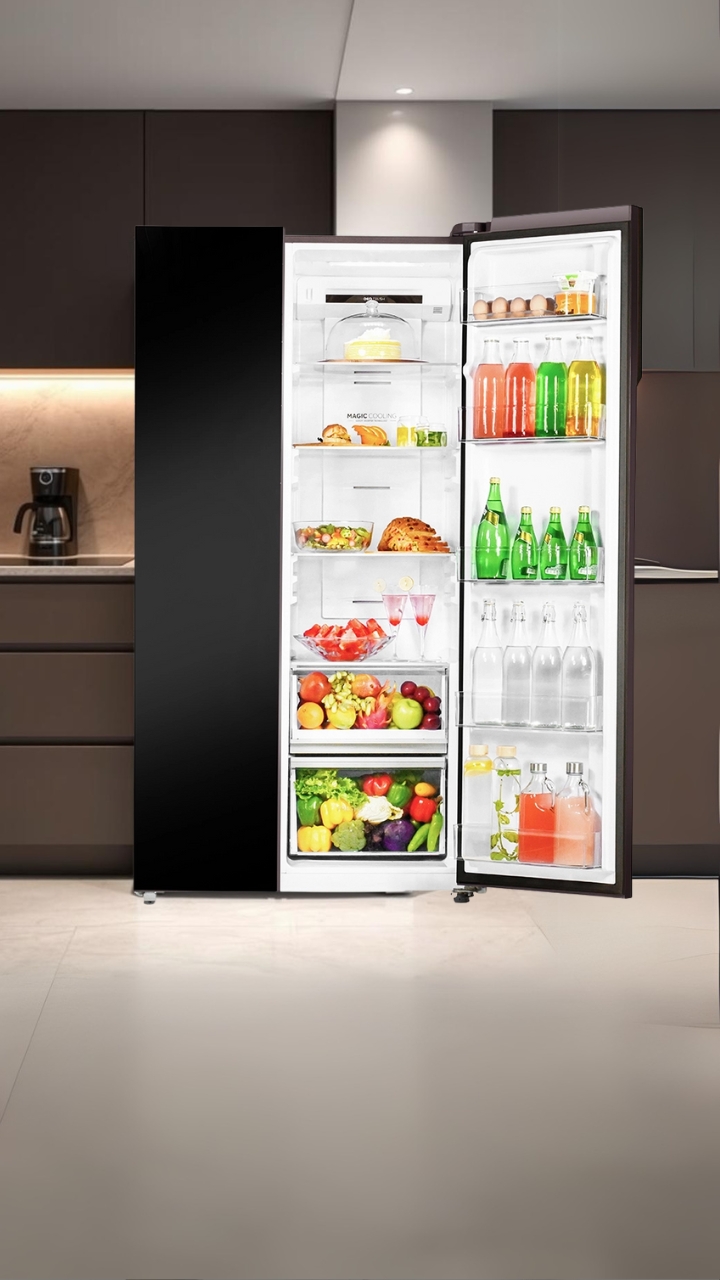 Featuring glass and steel finishes, models like HRS-682KYGU1 elevate kitchen aesthetics while providing ample storage, durability, and fingerprint-resistant surfaces, keeping your fridge looking spotless.
