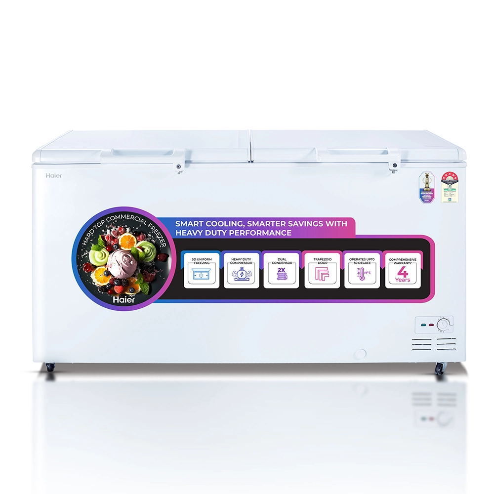 Haier HFC-400DM5 is a 5 star rating double Door Hard Top Convertible model with Inside metal liner with Normal Basket along with R290 hydrocarbon gas is designed for your storage needs. With the 383 liters interior space, you'll have enough room for everything you need to freeze. It has a hinged lid which is easily accessible. With the power indicator light you'll always know when the freezer is on. An excellent option for safely storing frozen food products such as meat, packaged foods, ice cream, vegetables and desserts while keeping them at the ideal storage temperature for extended life, maintaining quality and taste, preventing freezer burn and development of ice crystals. Ideal for usage across all commercial establishments. The said product comes with 4 year Comprehensive warranty. 4 Castor wheels are inside the box for easy movability at customer locations.